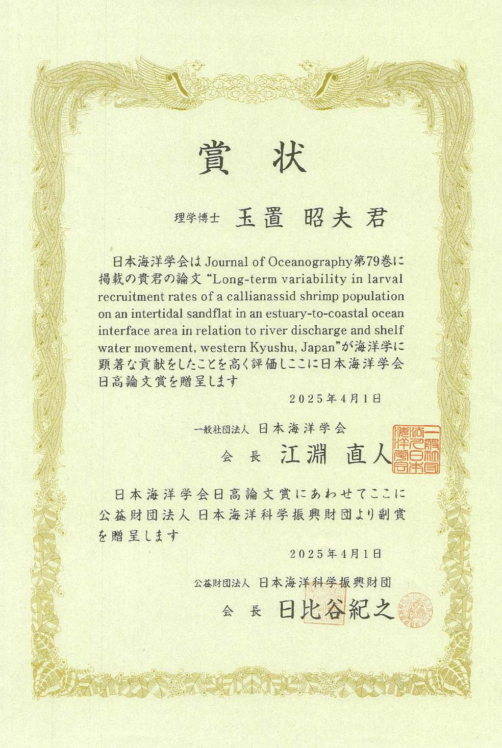 玉置昭夫名誉教授が2025年度日本海洋学会日高論文賞を受賞しました